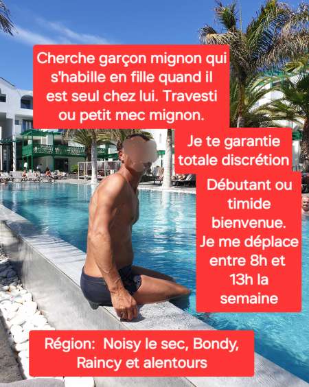 Cherche garçon mignon, androgyne ou travesti qui s'habille en fille quand il est seul chez lui et qui aime se faire masturber et sucer en gardant sa petite culotte et sa robe. On fait connaissance avant et si je te conviens je me déplace chez toi en te GARANTISSANT UNE TOTALE DISCRÉTION. Je viens la semaine de 8h à 14h à Noisy le Sec, Romainville, Les Lilas, Livry Gargan, le Raincy, Bagnolet, Pavillons sous Bois, Bondy. PRÉFÉRENCE À GARÇON PAS TRÈS POILU OU LISSE . Mec éfféminé, jeune puceau , travesti quotidien ou occasionnel, androgyne, petit timide, très petit sexe, look de fille : cette annonce est pour toi si tu veux un copain régulier très discret . Pas de barbe, pas de moustache, pas d'hotel et pas de mec musclé Matcho.